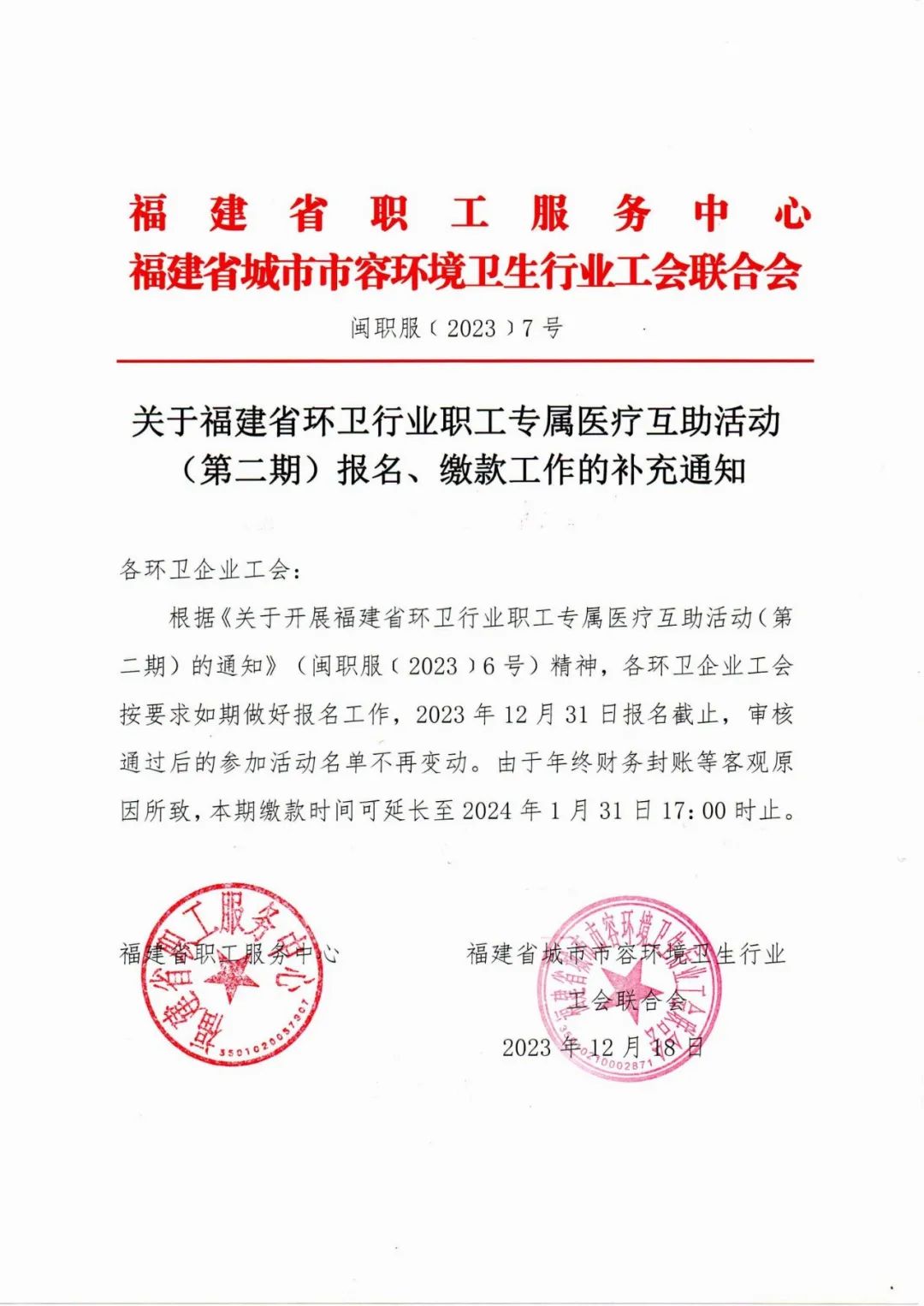 根据《关于开展福建省环卫行业职工专属医疗互助活动(第二期)的通知》 (闽职服( 2023 )6 号) 精神,各环卫企业工会按要求如期做好报名工作,2023年12月31日报名截止,审核通过后的参加活动名单不再变动。由于年终财务封账等客观原因所致,本期缴款时间可延长至2024年1月31日17:00时止。