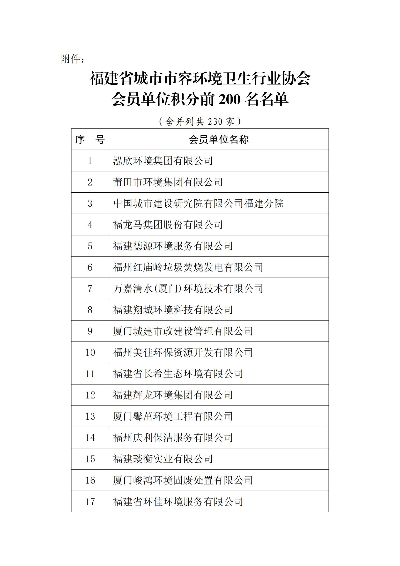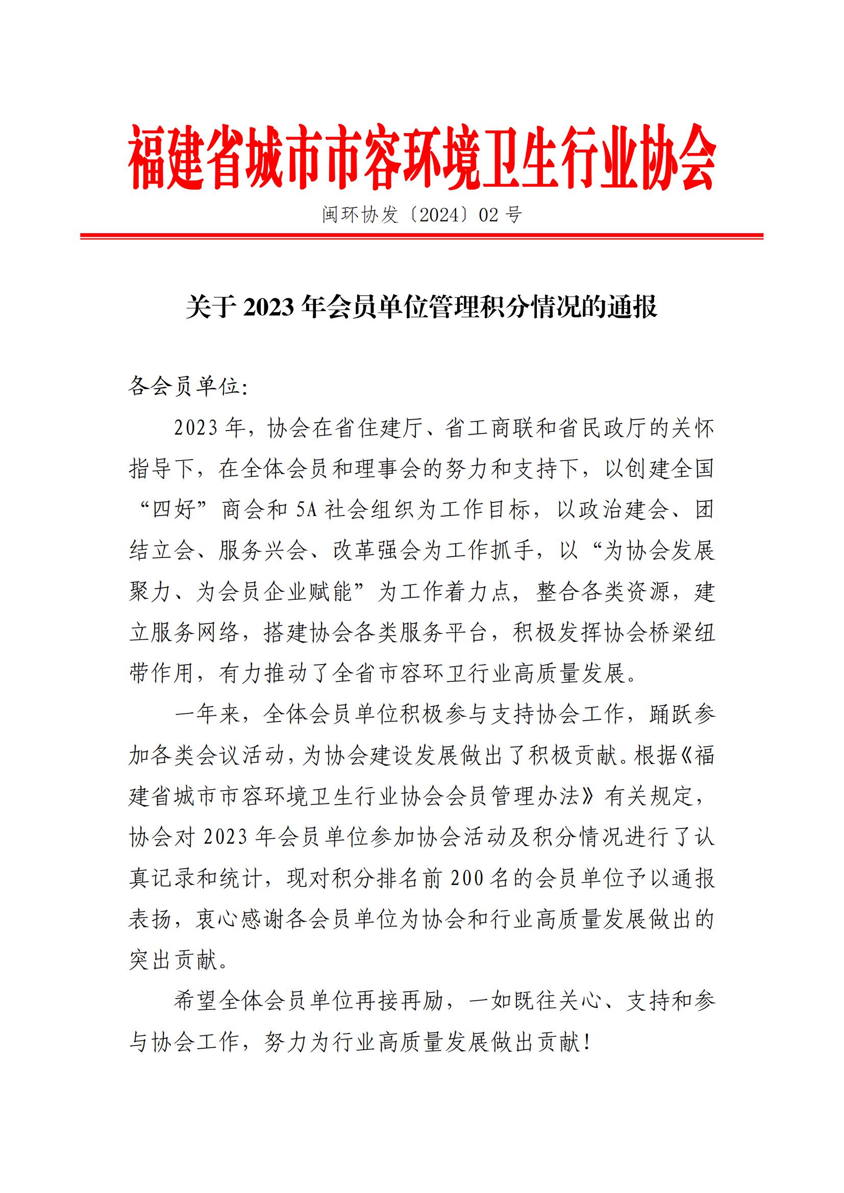 一年来,全体会员单位积极参与支持协会工作,踊跃参加各类会议活动,为协会建设发展做出了积极贡献。根据《福建省城市市容环境卫生行业协会会员管理办法》有关规定,协会对2023年会员单位参加协会活动及积分情况进行了认真记录和统计,现对积分排名前200名的会员单位予以通报表扬,衷心感谢各会员单位为协会和行业高质量发展做出的突出贡献。