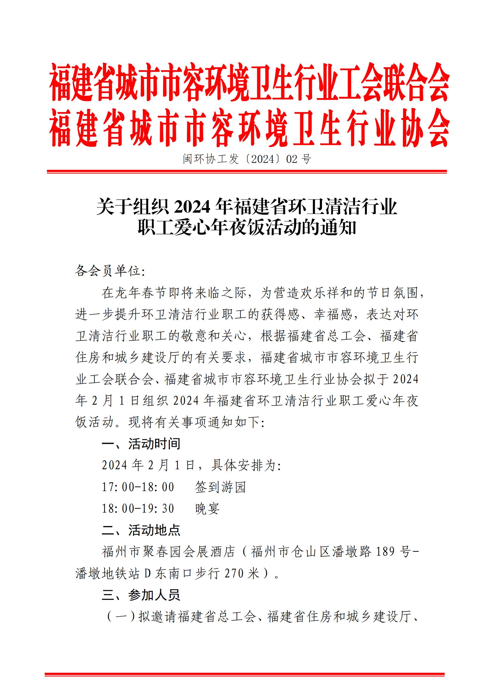 关于组织2024年福建省环卫清洁行业职工爱心年夜饭活动的通知