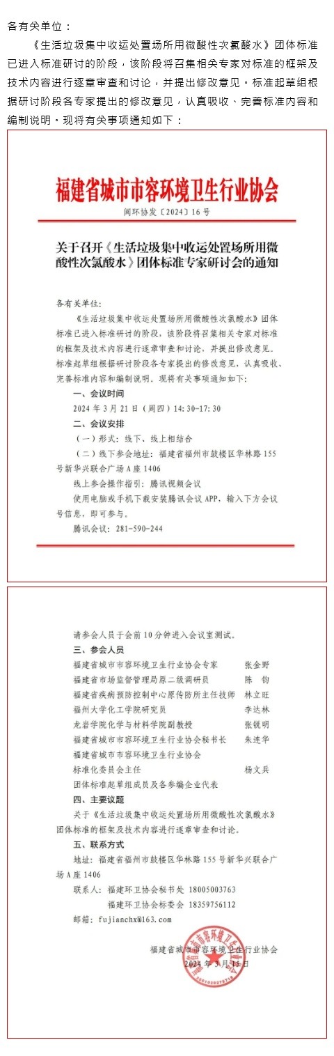 关于召开《生活垃圾集中收运处置场所用微酸性次氯酸水》团体标准专家研讨会的通知