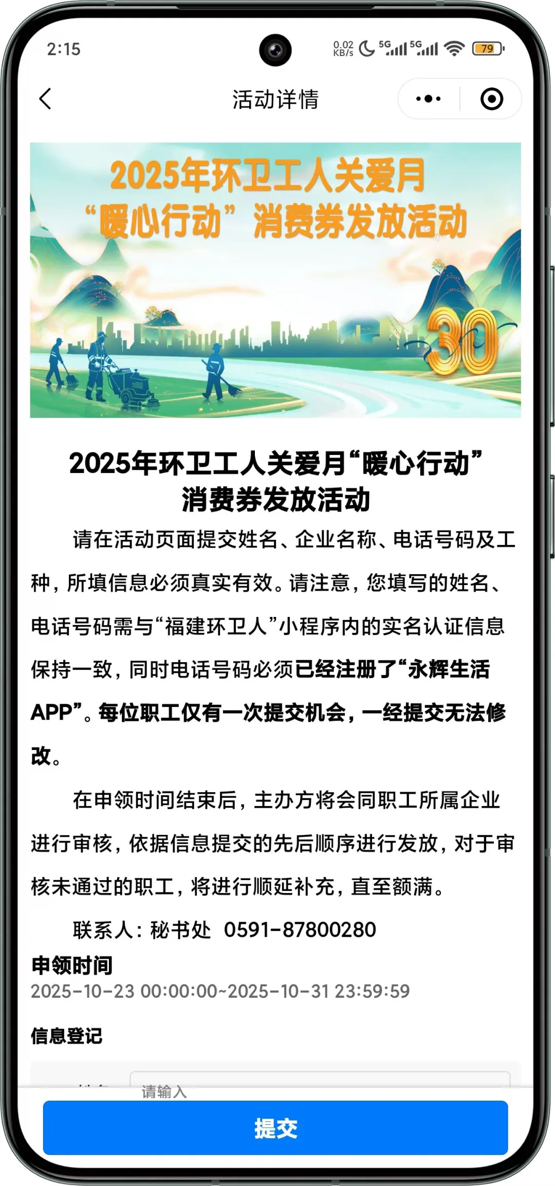 领取方式:登入福建环卫人,点击2025年环卫工人关爱月“暖心行动”消费券发放活动登记页面(需完成实名认证,教程附后),根据页面要求,如实填写个人信息。