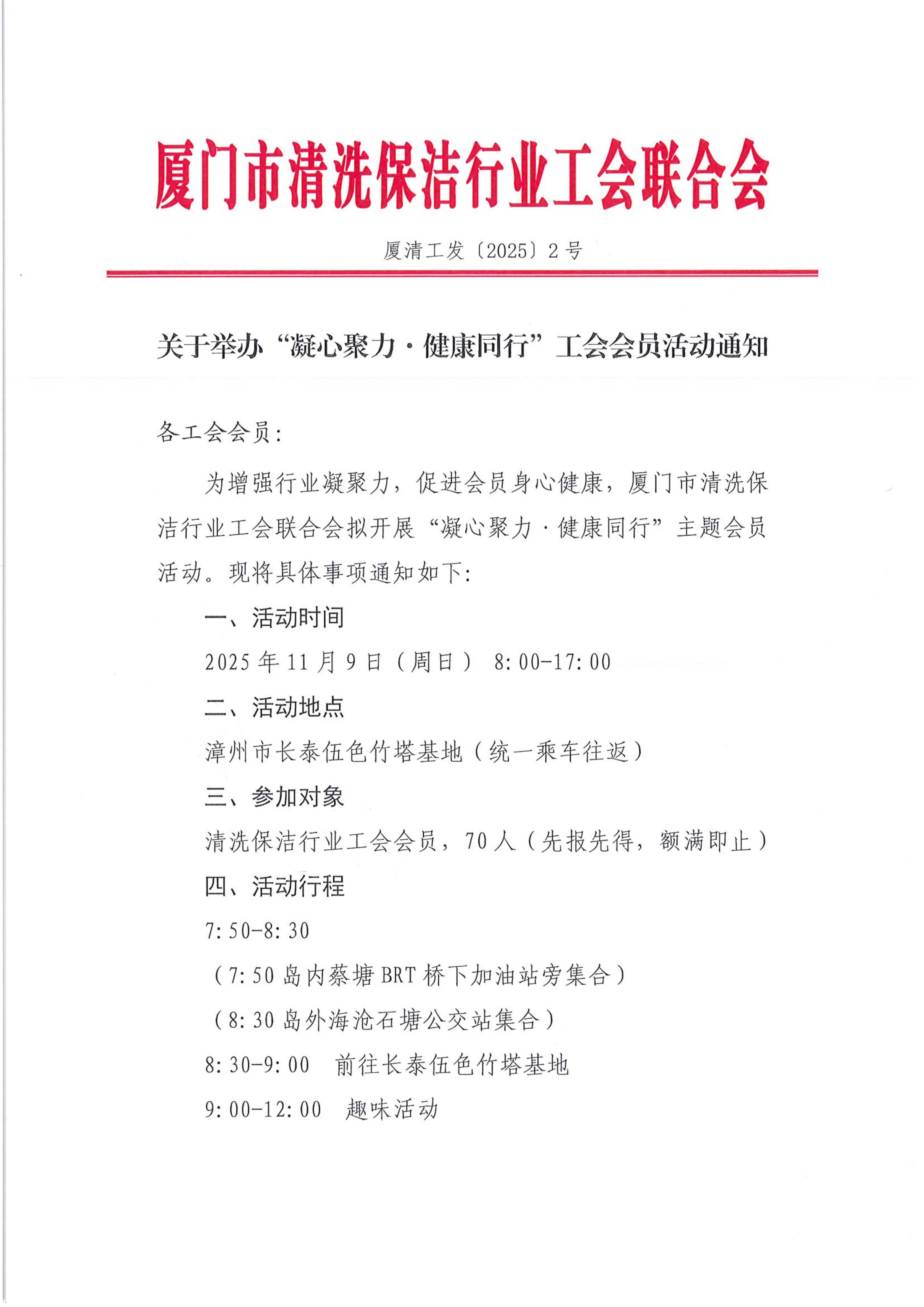 为增强行业凝聚力,促进会员身心健康,厦门市清洗保洁行业工会联合会拟开展“凝心聚力 · 健康同行”主题会员 活动。现将具体事项通知如下: