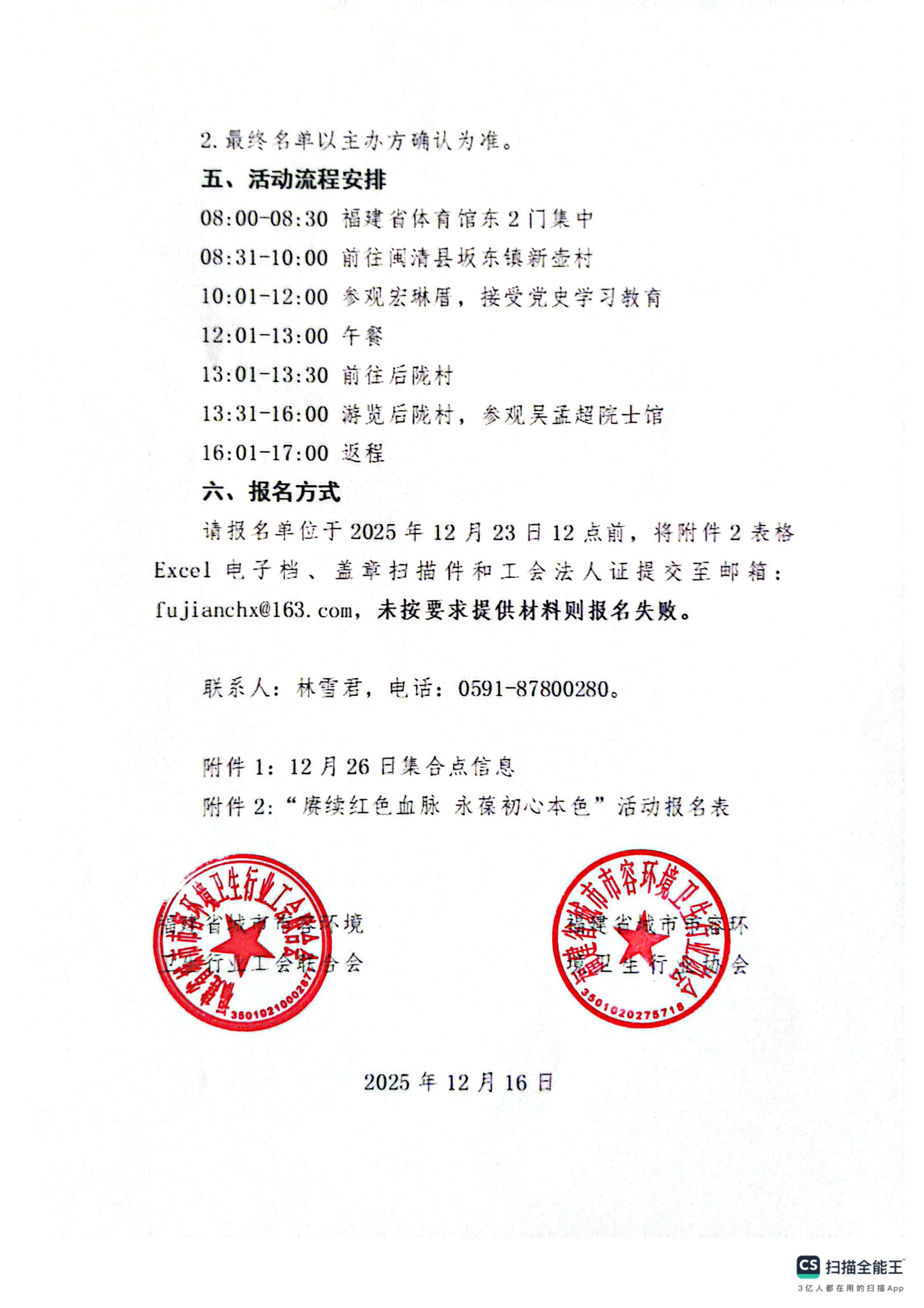 为全面贯彻落实党的二十届四中全会精神,扎实推进职工思想政治建设,福建省城市市容环境卫生行业协会及福建省城市市容环境卫生行业工会联合会决定联合开展“赓续红色血脉 永葆初心本色”主题教育活动,组织职工赴闽清县开展红色参观学习,沉浸式接受红色传统教育,激发广大职工劳动热情与创新创造潜能,为推动环卫事业高质量发展注入强大精神动力。现将有关事项通知如下: