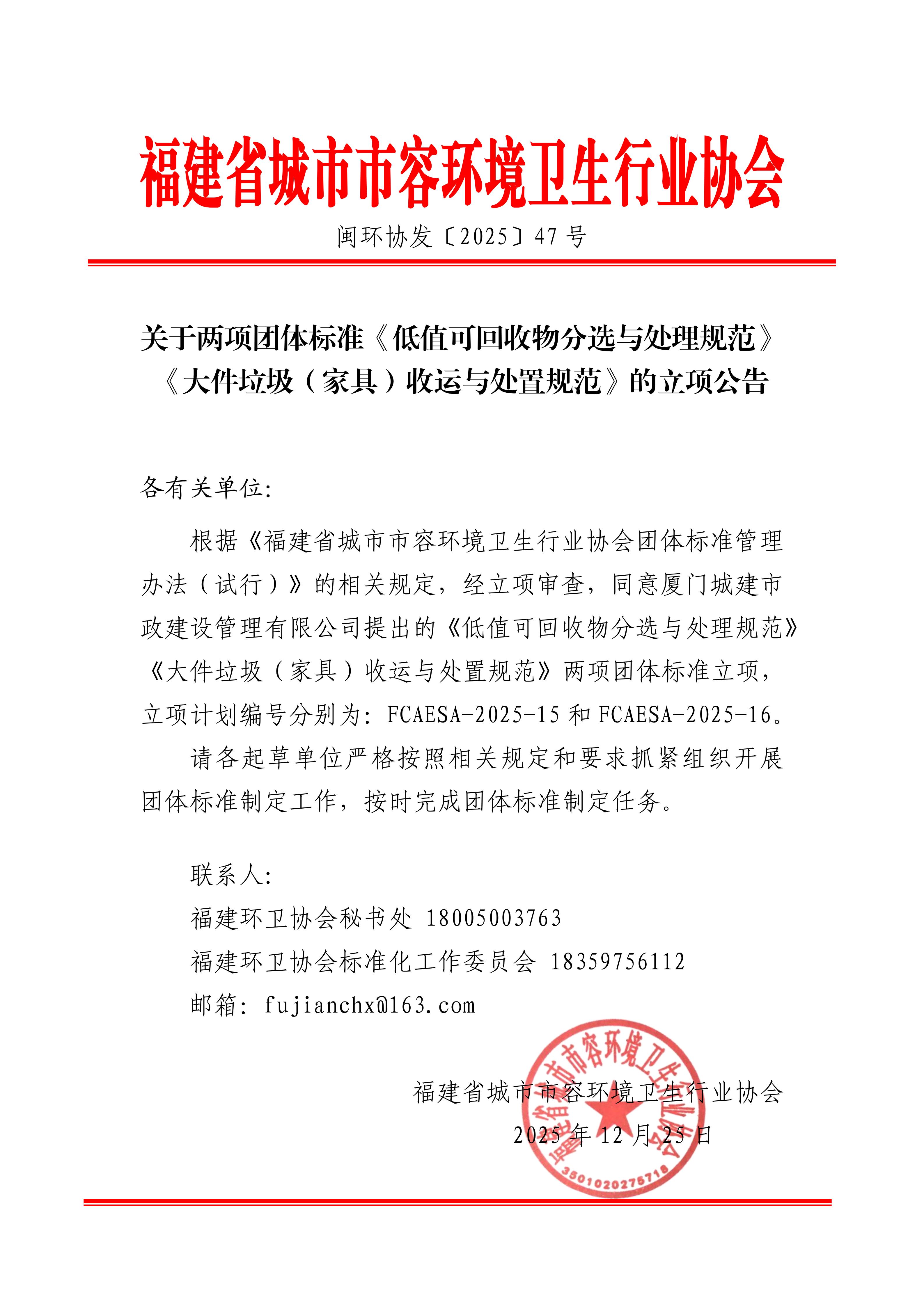 根据《福建省城市市容环境卫生行业协会团体标准管理办法(试行)》的相关规定,经立项审查,同意厦门城建市政建设管理有限公司提出的《低值可回收物分选与处理规范》《大件垃圾(家具)收运与处置规范》两项团体标准立项,立项计划编号分别为:FCAESA-2025-15和FCAESA-2025-16。