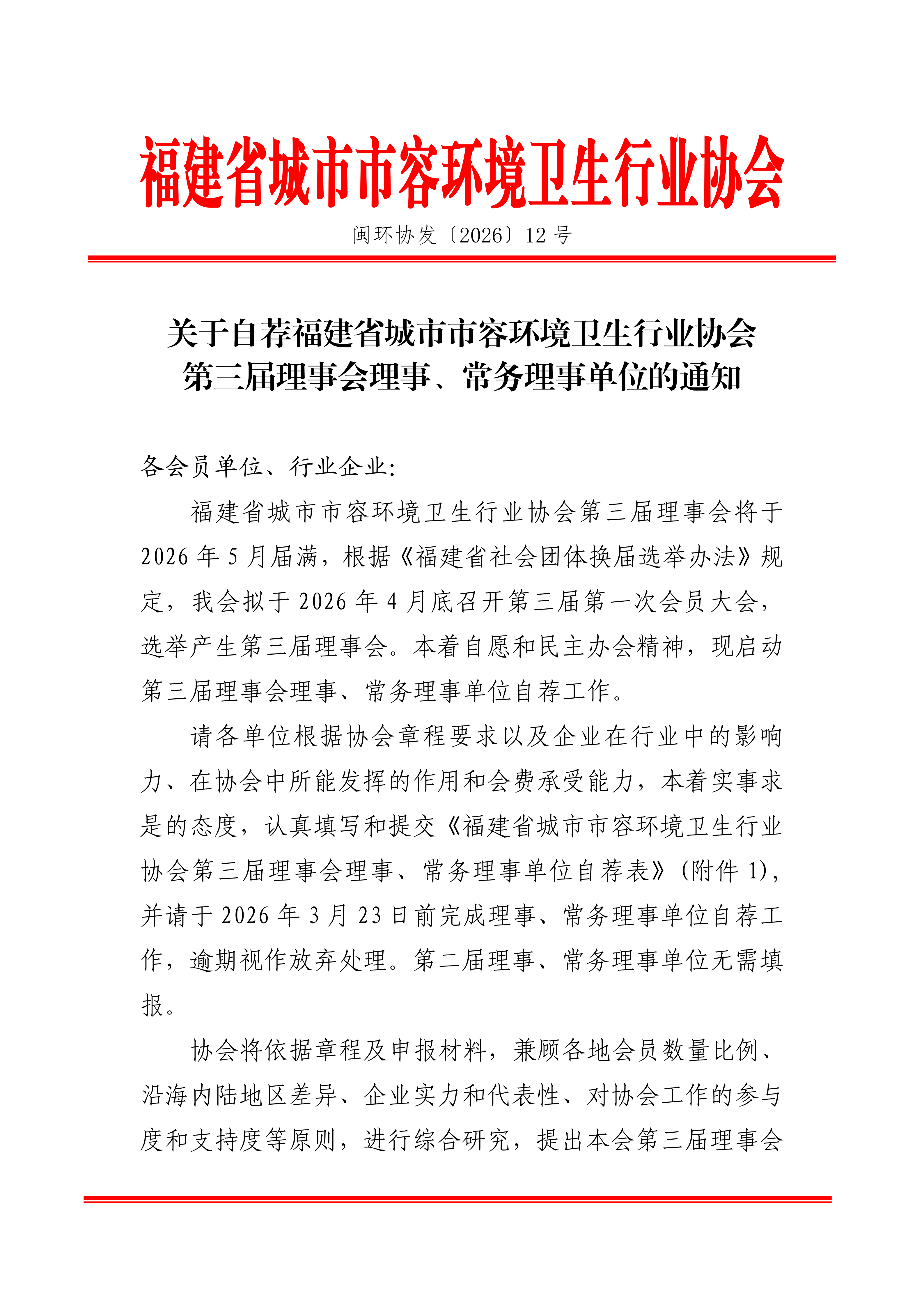 福建省城市市容环境卫生行业协会第三届理事会将于2026 年 5 月届满,根据《福建省社会团体换届选举办法》规定,我会拟于 2026 年 4 月底召开第三届第一次会员大会,选举产生第三届理事会。本着自愿和民主办会精神,现启动第三届理事会理事、常务理事单位自荐工作。
