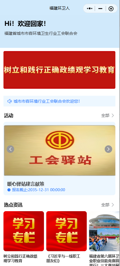 为积极响应全省全民阅读号召,推动学习型行业建设,赋能环卫职工成长进步,福建环卫人小程序全新上线《树立和践行政绩观学习教育》《习近平与一线职工朋友们》两大学习专栏,诚邀全省环卫职工共沐书香、共学思想、共践初心,在阅读学习中凝聚奋进力量,以实干担当守护城市洁净!