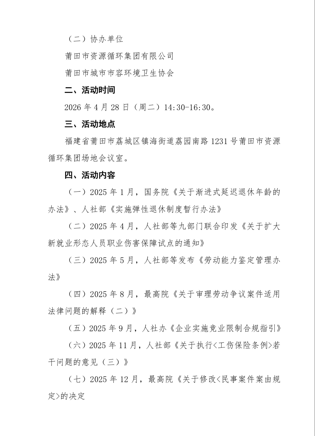 为迎接五一国际劳动节,深入贯彻习近平总书记关于构建和谐劳动关系重要指示精神,面向职工普及人社最新政策法规、明晰劳动用工权责规范,引导企业依法合规用工、职工依法理性维权,从源头防范化解劳资矛盾纠纷,持续优化行业用工环境。福建省城市市容环境卫生行业工会联合会和福建省城市市容环境卫生行业协会联合开展“法治保劳权 共筑平安岗”普法活动,特邀福州市和谐劳动关系服务中心主任、福建致用律师事务所创始合伙人、资深劳动法律师方维忠律师,围绕劳动用工热点难点政策以案释法、精准答疑。现将有关事项通知如下: