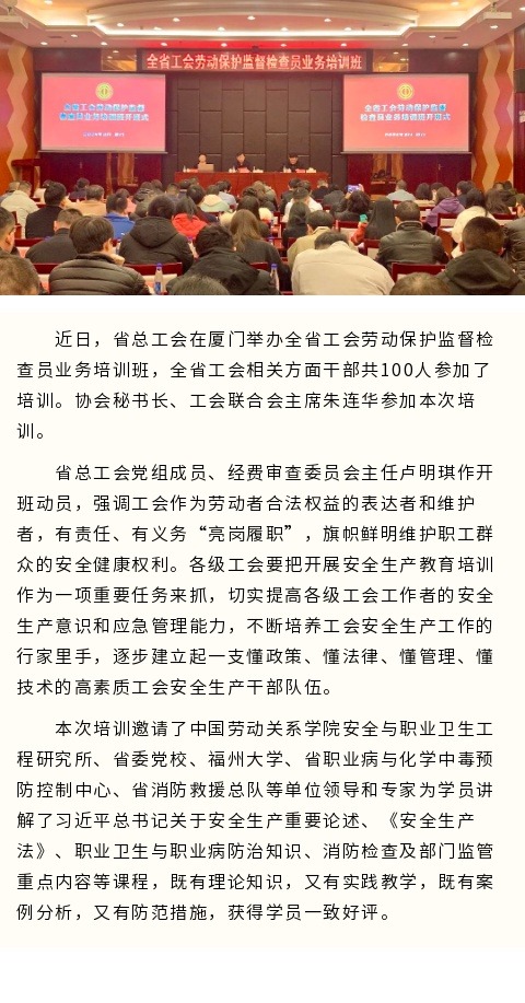 秘书长、工会联合会主席朱连华参加省总工会举办的全省劳动保护监督检查员培训班
