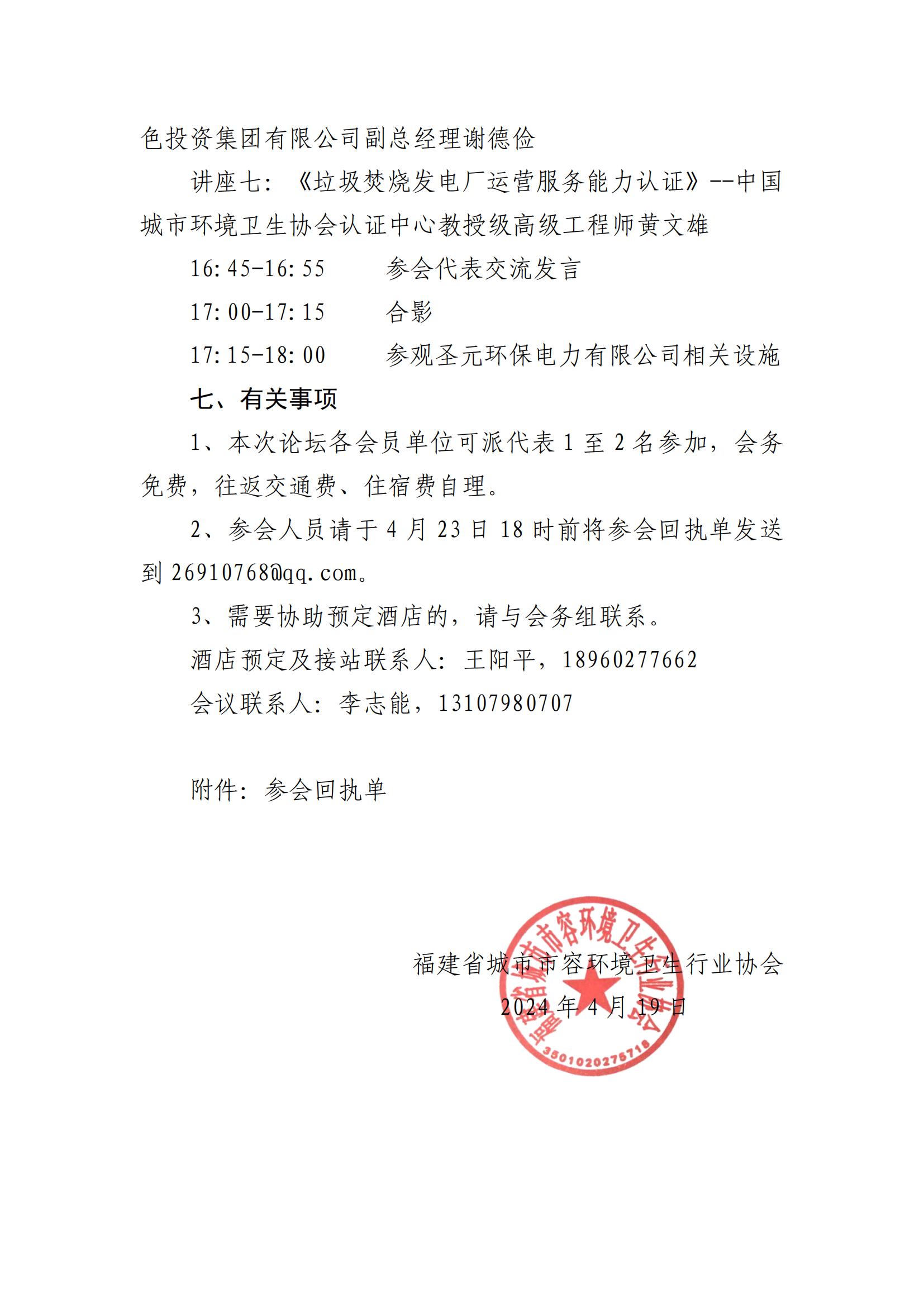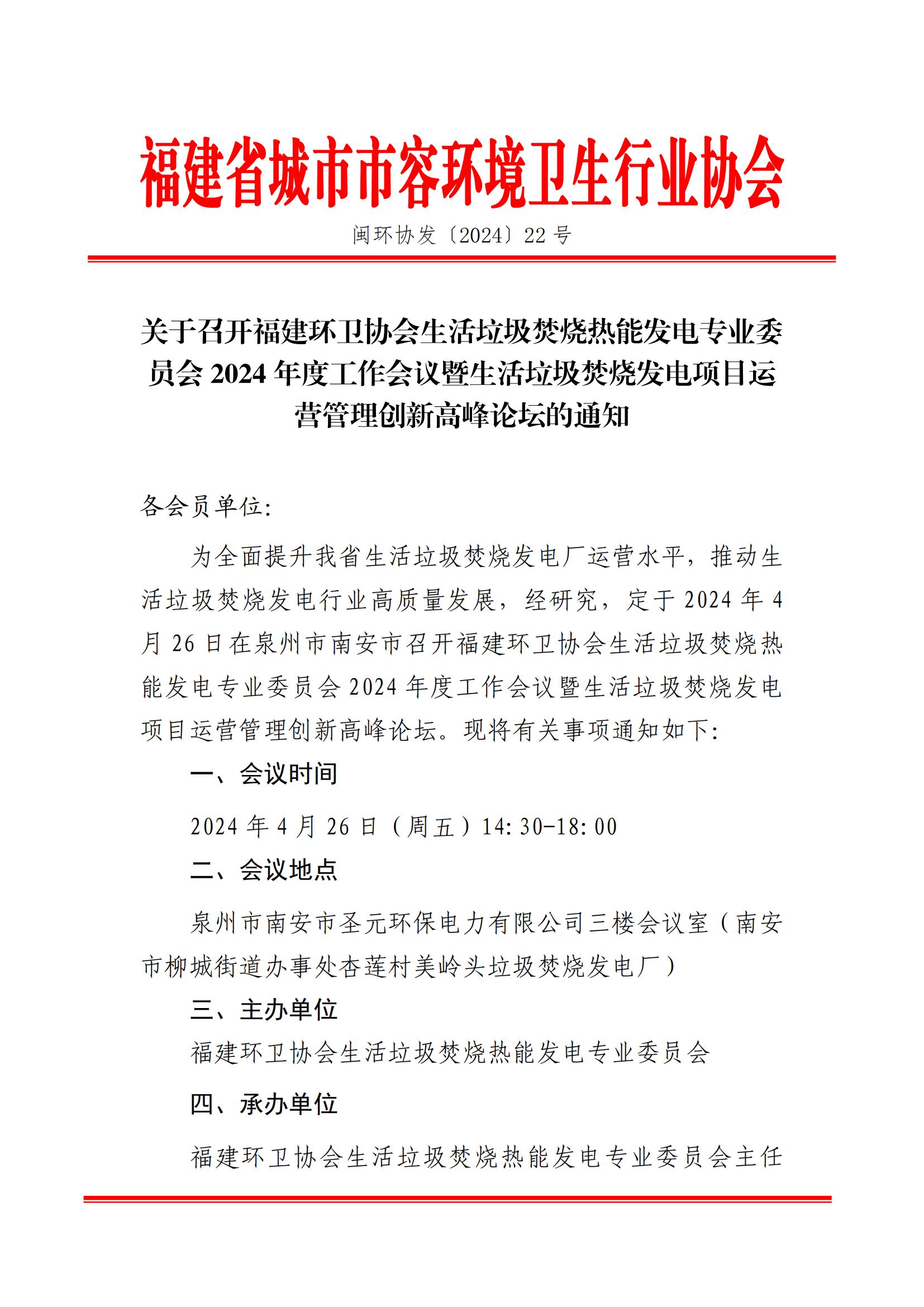 关于召开福建环卫协会生活垃圾焚烧热能发电专业委员会2024年度工作会议暨生活垃圾焚烧发电项目运营管理创新高峰论坛的通知