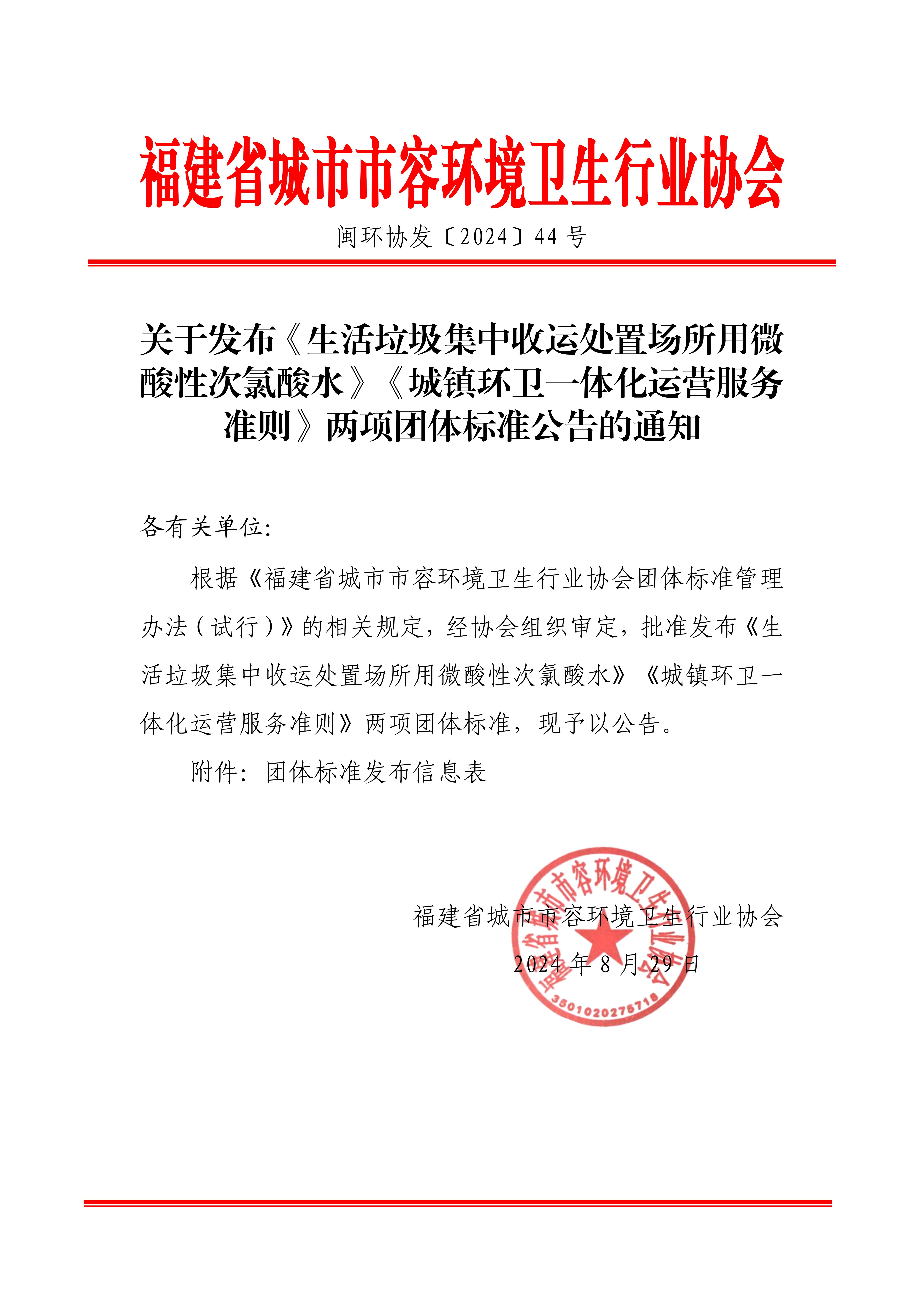 关于发布《生活垃圾集中收运处置场所用微酸性次氯酸水》《城镇环卫一体化运营服务准则》两项团体标准公告的通知