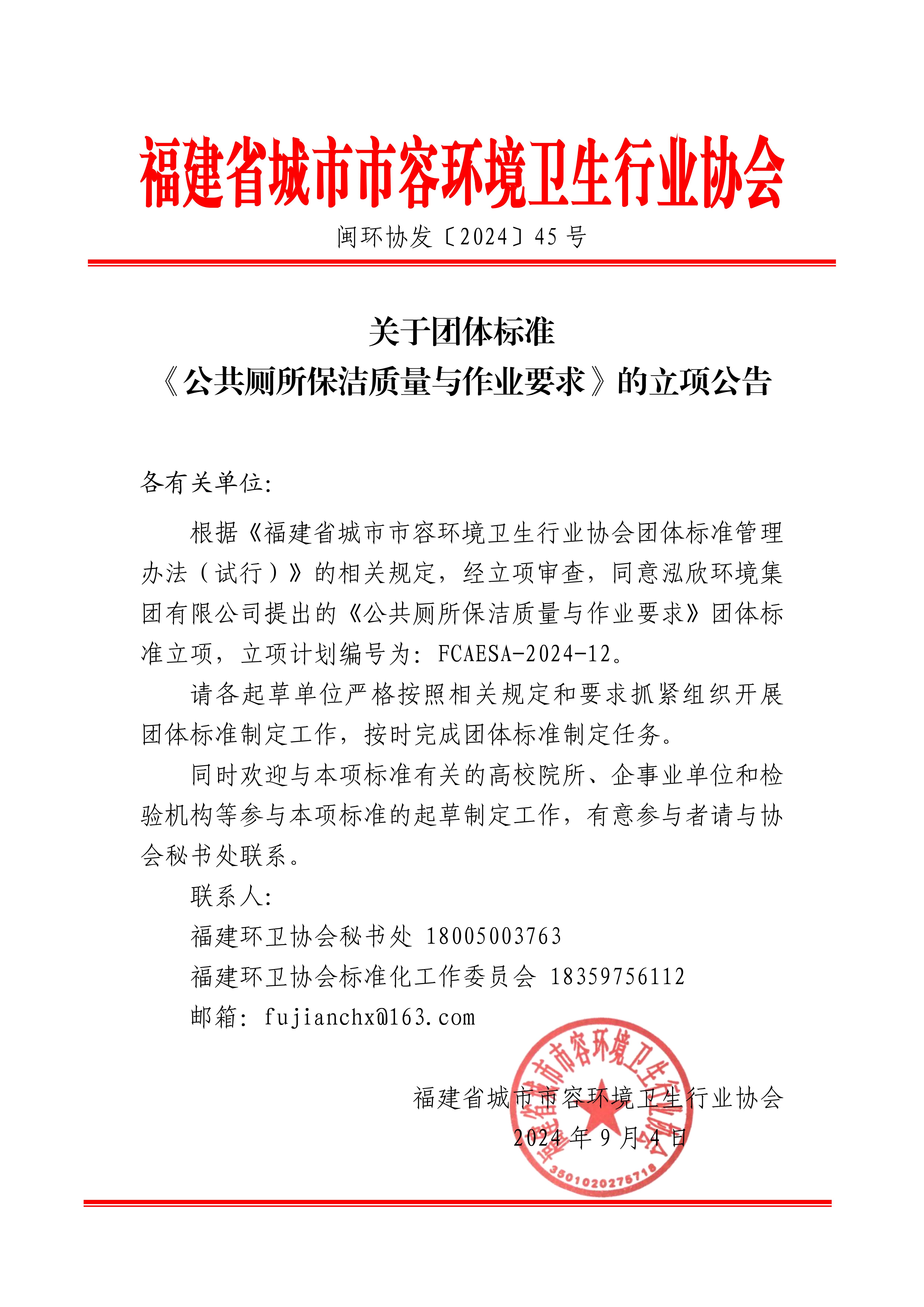 关于团体标准《公共厕所保洁质量与作业要求》的立项公告