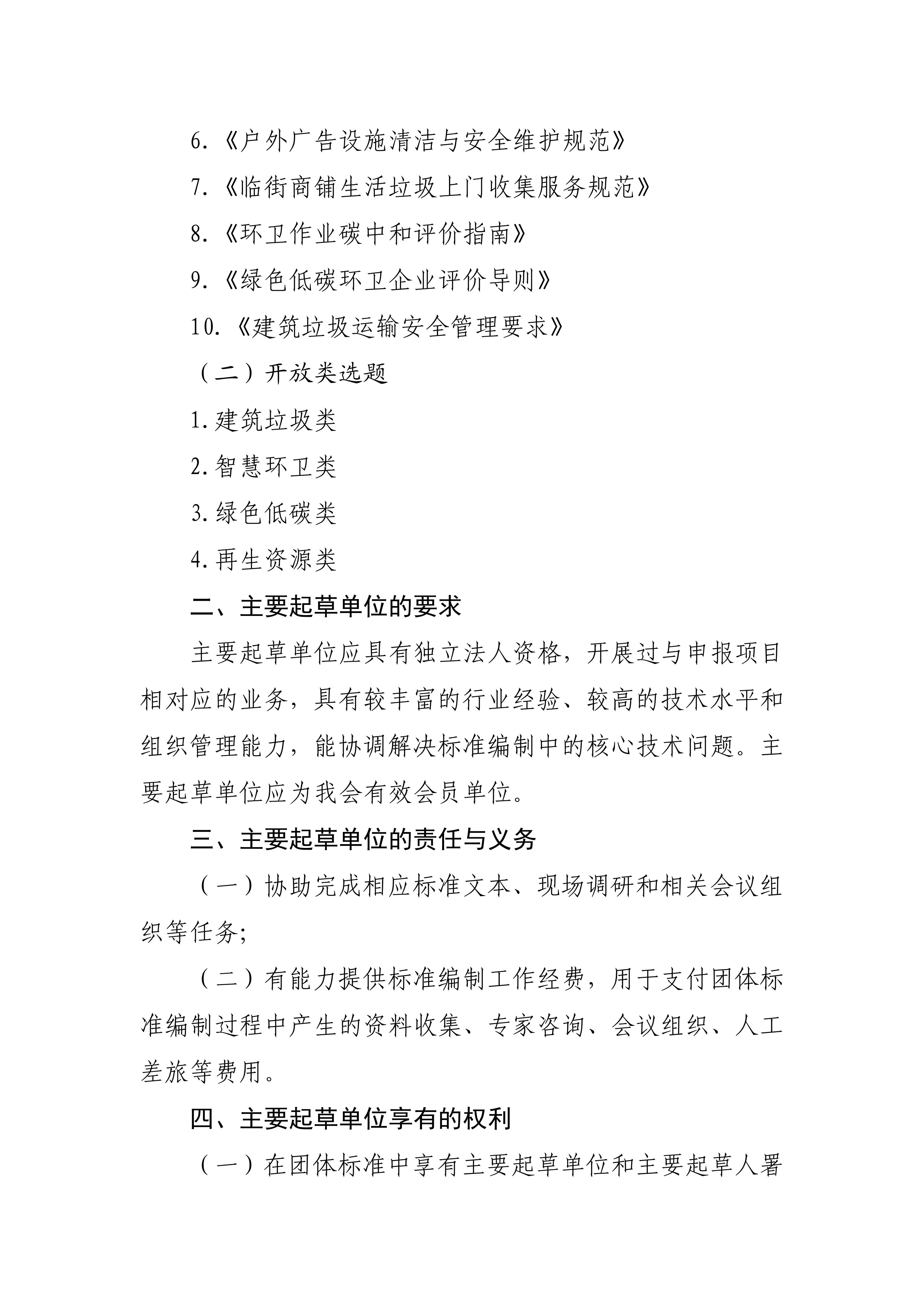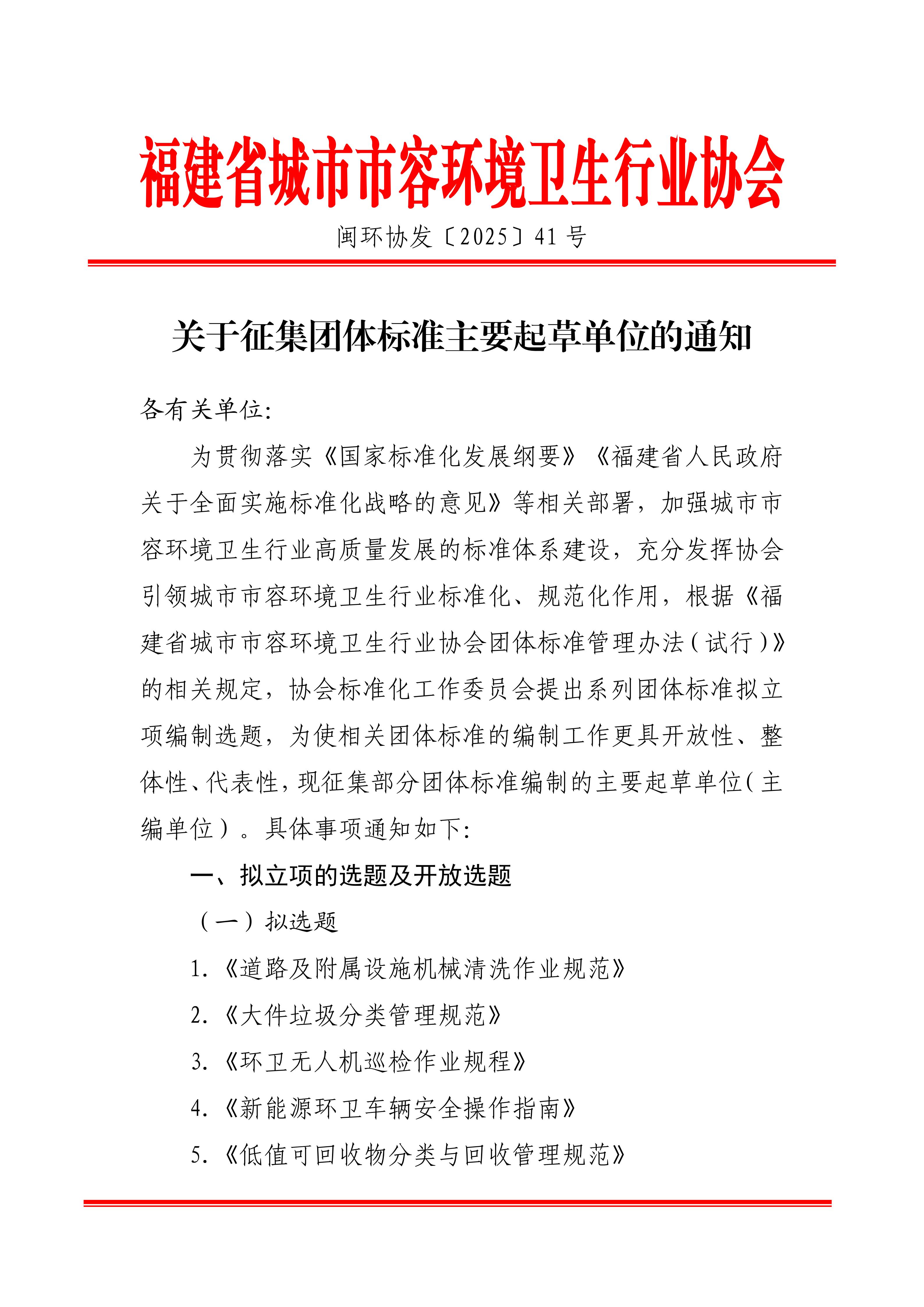 为贯彻落实《国家标准化发展纲要》《福建省人民政府关于全面实施标准化战略的意见》等相关部署,加强城市市容环境卫生行业高质量发展的标准体系建设,充分发挥协会引领城市市容环境卫生行业标准化、规范化作用,根据《福建省城市市容环境卫生行业协会团体标准管理办法(试行)》的相关规定,协会标准化工作委员会提出系列团体标准拟立项编制选题,为使相关团体标准的编制工作更具开放性、整体性、代表性,现征集部分团体标准编制的主要起草单位(主编单位)。具体事项通知如下: