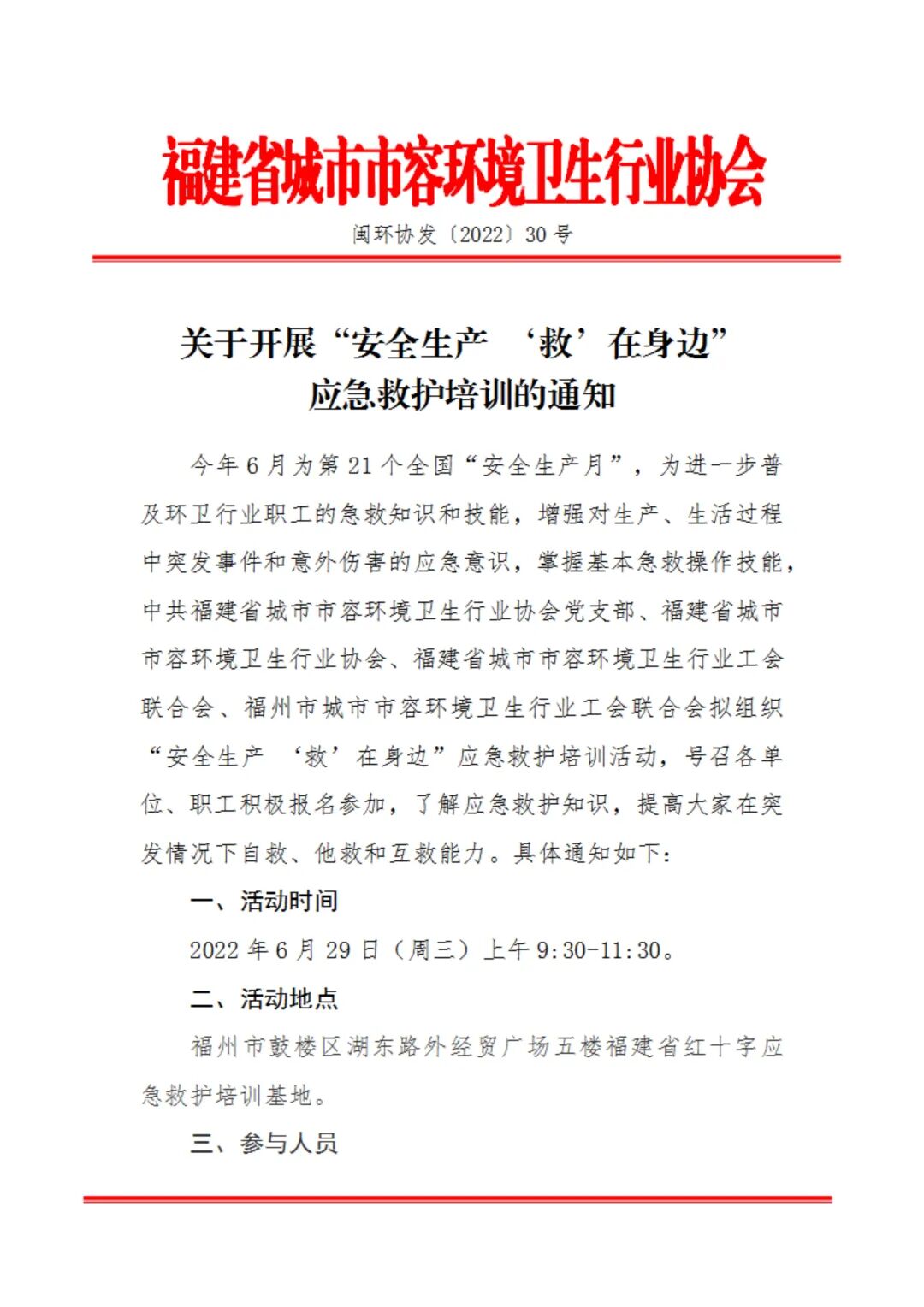 今年6月为第21个全国“安全生产月”,为进一步普及环卫行业职工的急救知识和技能,增强对生产、生活过程中突发事件和意外伤害的应急意识,掌握基本急救操作技能,中共福建省城市市容环境卫生行业协会党支部、福建省城市市容环境卫生行业协会、福建省城市市容环境卫生行业工会联合会、福州市城市市容环境卫生行业工会联合会拟组织“安全生产‘救’在身边”应急救护培训活动,号召各单位、职工积极报名参加,了解应急救护知识,提高大家在突发情况下自救、他救和互救能力。具体通知如下所示: